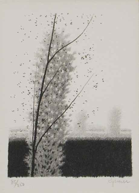 "In lithography my great excitement came from effects I can best describe as silvery, like ghosts of gray, grays faint yet fully drawn, with nuances that gave the appearance of images have been just breathed onto the stone, and from there with Burr [Miller]’s magic coaxed to the paper…When printing went smoothly the experience was deeply rewarding, a sense of well-being at having brought to life a vision that could have gone wrong in so many ways, at so many moments. These times were like gifts from an unpredictable printing god, and were the events that made painful failures endurable. It was essential to know my goals could be reachable." - Robert Kipniss, 2002