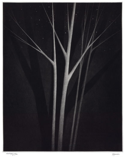 Tall Trees at Night is one of Kipniss's many mezzotints that view trees fairly close up at dusk or night and show a play of light upon them. The characteristics that became increasingly prominent in his mature work, his concern with capturing the essence of form and with even more subtle light effects, are clearly apparent. The trees in Kipniss's mezzotints have an especially strong purity of form when only their trunks are depicted. Sometimes leaves are spread across the trees, adding more movement and increasing the technical challenge.