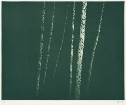 Window w/vase & forest (2000) is representative of still lifes that show a vase of plant cuttings, most often of stems with leaves. The vase is generally viewed close up before a window on a surface that may or may not be visible. Occasionally the bottom part of the sash is showing, and usually trees are beyond. Here, part of the view into the distance is through three layers of glass, and the form to the left is part of a chest of drawers. A painting done in reverse predates this print, and in both Kipniss extemporized the pale, delicate scrim of trees. The print is in four major museum collections, among them the Metropolitan Museum of Art, New York City, and the Fine Arts Museums of San Francisco, California Palace of the Legion of Honor.